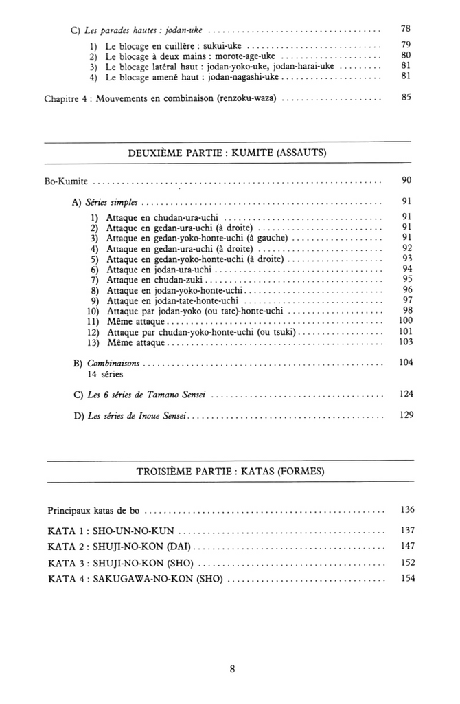 Ce troisième tome de l'Encyclopédie des Arts Martiaux consacré aux arts des "îles du sud" traite du bâton. On l'appelle BO, ou KON. La technique est BO-JUTSU, mais l'art est KONPO. Si le passage de la technique (Jutsu) A la Voie (Do), au sens de "chemin de l'accomplissement de soi" à travers une pratique guerrière, date d'une centaine d'années seulement, les modalités techniques du simple maniement du bâton sont probablement aussi vieilles que les querelles entre les hommes. Primaire ou sophistiqué, a base de simple gourdin ou de bâton à forme étudiée, anguleux, tranchant, rond, pointu, en bois dur ou en bambou, la "technique du bois" s'est élaborée un peu partout dans le monde, émanation de tous les peuples, comme la reprise la plus naturelle et la plus simple pour se défendre ou attaquer. De la massue de l'homme préhistorique à la canne de la Belle Époque, en passant par les armes d 'hast du Moyen Age (lances, hallebardes, fauchards), le maniement a pu s'affirmer avec le temps, ou quelque peu varier en fonction de l'expérience sur le terrain et de certaines recherches particulières et locales, mais ses grands principes sont restés. Sa terrible efficacité aussi.