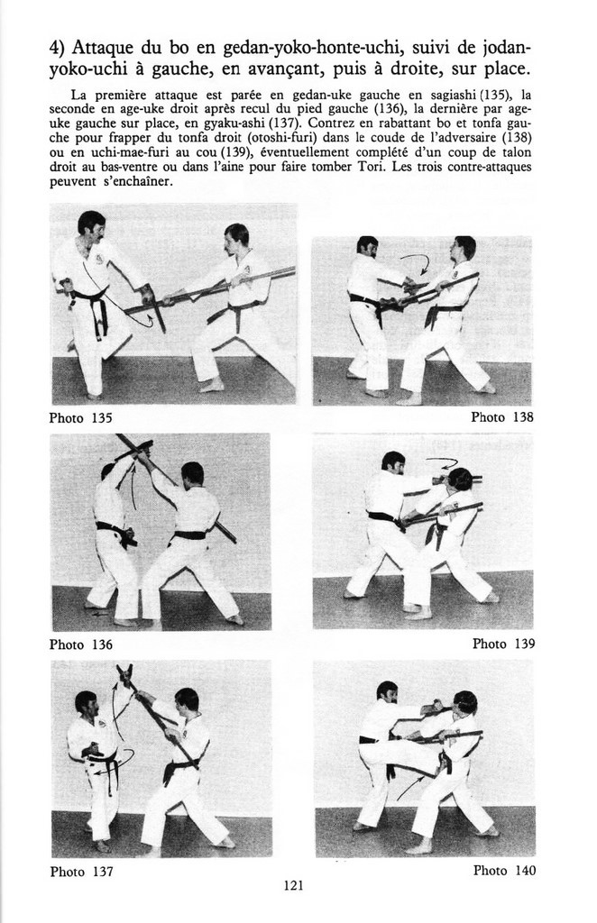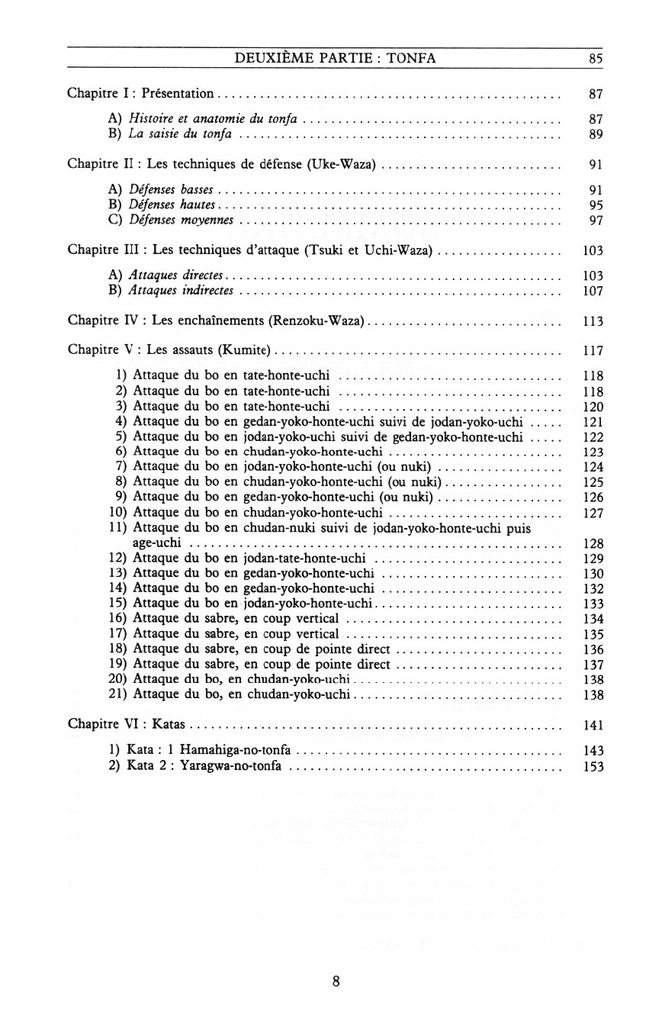 Nunchaku et Tonfa sont deux autres arts majeurs des Ko-Budo d'Okinawa. Comme celle du Sai, leur maîtrise est complexe, au-delà d'une manipulation élémentaire mais suffisante pour créer l'illusion de l'efficacité, piège classique des techniques martiales venues d'orient. On ne peut que regretter qu'une pratique primaire et hâtive suffise à certains pour faire étalage d'une violence retranchée derrière une soi disante nécessité d'autodéfense. Cela provoque parfois, hélas, certains débordements de "justiciers" au nunchaku, faits divers repris par une presse déjà peu tendre avec les arts martiaux, ou, au mieux, des démonstrations publiques qui tiennent plus du cirque que de l'affirmation de quelque chose de vraiment profond. Le folklore dont s'entoure parfois le Ko-Budo, pour plaire lors de telles démonstrations, médias obligent, fait passer à coté de l'essentiel. Et ne parlons même pas des formes sportives de ces arts qui ont déjà permis de mettre sur pied des Championnats de nunchaku. C'est, à chaque fois, tout autre chose que l'art proposé par les derniers maîtres de Ko-Budo. Sortis de leur contexte, les Ko-Budo ne sont plus les Ko-Budo : il en reste des outils plus ou moins étranges, qui sont aussi devenus des armes. Mais celles-ci ne peuvent intéresser le Budoka que dans le cadre d'un dojo.