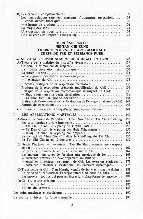 Chi-Kung (prononcé "Chee Goong"), Chi-Kong ou GiGong (en pinyin) apparaît aussi sous le nom de Nei-Kung (nei-gong) qui veut dire " Kung-Fu interne " (Nei-Chia-Kung-Fu ou Nei-Dan-Gung-Fu). On y trouve Chi (l'air ou l'énergie qui habite tout être vivant) et Kung (référence une discipline, un travail, sous entendant la patience, et à l'effort dans la durée, d'où le Fu du Kung-Fu). Chi- Kung est donc l'art de la circulation de l'énergie interne à l'être vivant, à travers la maîtrise de la respiration. C'est le très long travail que fait l'homme sur lui même pour prendre conscience de cette énergie, la développer, la diriger, la retenir ou la propulser, la contrôler avec son esprit. A partir de là, on peut envisager ce travail dans quantité de directions, avec des objectifs nombreux et divers. Chikung est en réalité un vaste sujet...