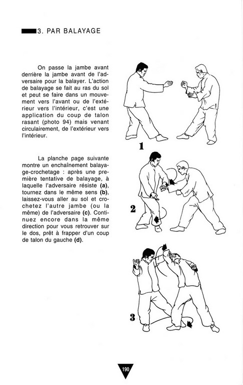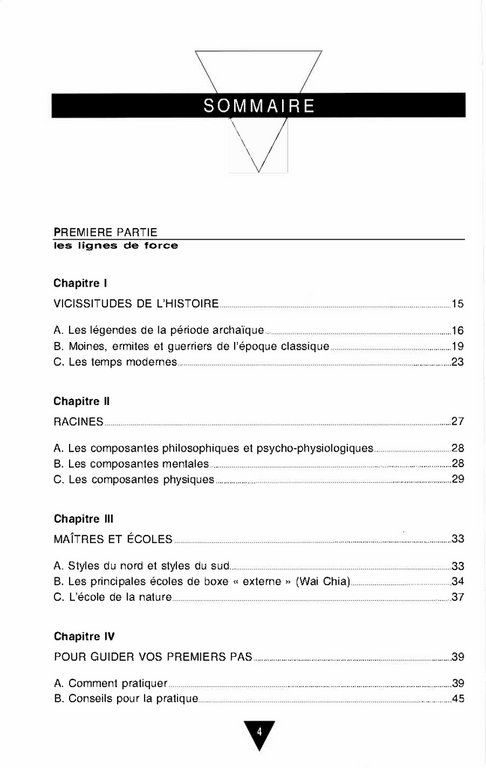 Le terme de Kung-Fu est devenu, ces dernières années, le nom générique de l'ensemble des techniques individuelles chinoises de combat, qu'elles se pratiquent d'ailleurs avec ou sans armes. Et l'on dénombre autour de quatre cents styles considérés par les spécialistes comme sérieux, c'est-à-dire remontant souvent à plusieurs siècles ... auxquels il faut ajouter tous les styles récents, nés du fantastique engouement du public occidental pour le Kung-Fu depuis l'année 1973, celle de la mort d'un certain Bruce Lee. Cet acteur américain, originaire de Hong-Kong, devint en quelques mois une vedette internationale après être apparu dans quelques films d'arts martiaux qui vont rester dans l'histoire du cinéma comme des modèles du genre. II fut indiscutablement responsable de la spectaculaire vulgarisation du Kung-Fu auprès des jeunes, mais sa disparition soudaine, en pleine gloire, laissa sans lendemain le style très personnel qu'il crut bon de créer lui-même, le " Jeet Kune Do ". D'autres styles, les plus fantaisistes, fleurissent dans la foulée pour disparaître tout aussi vite, semant le désarroi auprès d'un public confiant en des prouesses de cinéma. Ce livre ne veut accorder aucune attention à ces écoles modernes, qui ne représentent rien en profondeur. Le véritable Kung-Fu est en soi déjà suffisamment complexe, ramifié en quantité de directions déjà assez difficiles à suivre pour que nous n'ayons pas éprouvé le besoin d'égarer davantage encore le lecteur dans le cadre de cet ouvrage d'initiation.