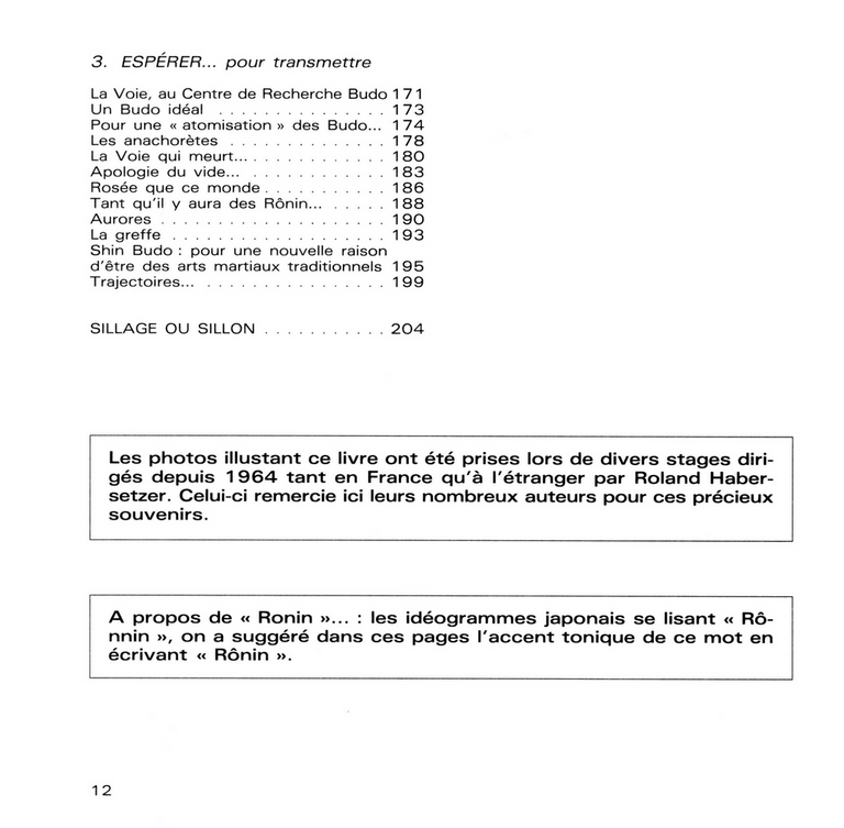 Ce livre retrace l'itinéraire d'un vrai "Ronin" (un Samouraï sans maître), pionnier du Karatedo en Europe, à travers ses écrits, ses prises de position, ses réflexions sur l'art du combat, qui sont autant de traces laissées pour la défense et l'illustration de cette "certaine conception des arts martiaux" à l'intention de ceux qui, aujourd'hui ou demain, choisiront de redécouvrir le message vivifiant d'une vraie Tradition.