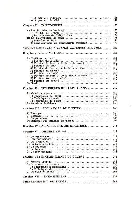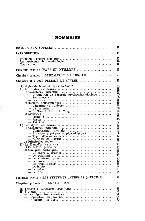 En présentant ce nouveau livre au public passionné d'arts martiaux nous n'avons pas voulu céder une mode éphémère ; cet ouvrage s'inscrit dans la même optique que celle qui a été appréciée dans notre "Karaté-Do", à savoir, faire le point sur un art martial particulièrement délicat à circonscrire par le néophyte, informer à partir d'une documentation abondante puisée auprès de maîtres représentatifs des principales écoles et risquer une première synthèse h travers la jungle des styles. Nous voulions, pour la première fois à notre connaissance, intégrer dans un même manuel tous les aspects du Kung-Fu afin d'en faire une base commune particulièrement utile lors d'un premier contact, et à partir de laquelle le choix d'un style ou d'une école s'avérera plus facile. Afin de lui conserver ce caractère de recueil technique complet, tout en restant dans les limites d'un volume raisonnable, nous avons restreint le texte explicatif à l'essentiel. A travers de multiples facettes, le Kung-Fu est une réalité unique et passionnante. Notre ambition est de vous en convaincre dans les pages suivantes. Bien entendu une telle tentative aurait été vouée à l'échec si nous n'avions pu établir des contacts fructueux avec d'authentiques "sifu" (maîtres de Kung-Fu) de Hong-Kong et de Taiwan et sans l'aide précieuse que nous avons rencontré auprès de nombreuses personnalités chinoises qui ont bien voulu nous appuyer dans notre projet...