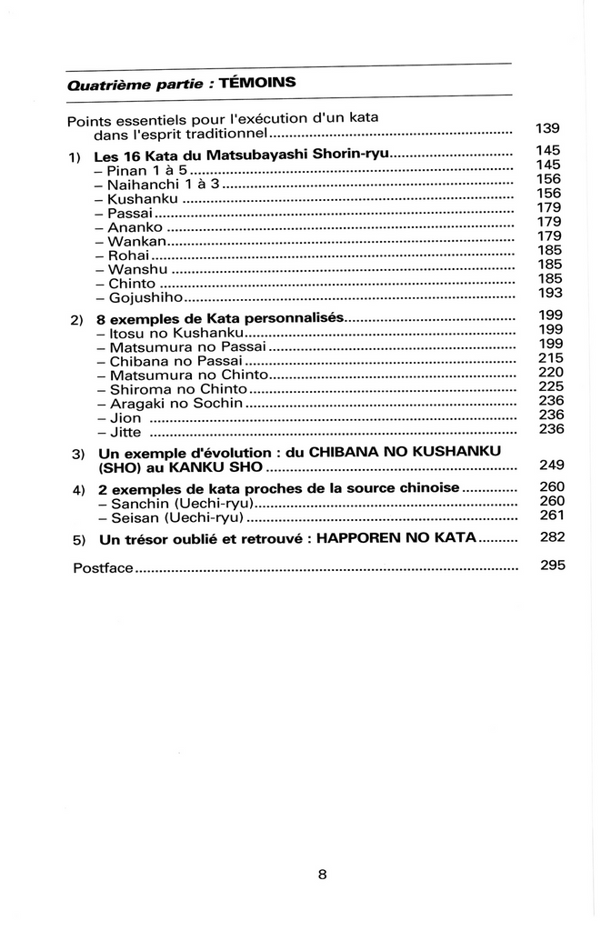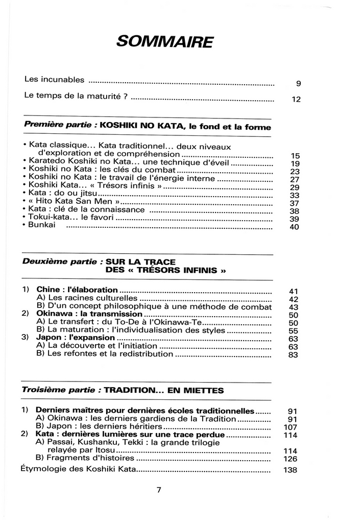 Le Kata ancien est au Karatédo moderne ce que les incunables, ces premiers textes imprimés avec soin il y a des siècles et dont les rares exemplaires survivant aux fureurs du temps sont précieusement conservés dans des musées ou des collections particulières, sont restés aux livres réalisé suivant les technologies les plus modernes : quels que soient les attraits, et parfois les avantages, de l'esthétique d'une impression moderne, il y a dans les documents anciens un souffle, un message, une profondeur, une volonté de transmettre et d'enseigner, une sorte de "Ki" irremplaçable. Le Kata ancien renferme pour qui sait, et veut voir, le sens profond des choses, de la vie et de la quête de l'homme en perpétuel devenir. Il est très important de laisser à celui-ci, d'aujourd'hui comme demain, la possibilité de consulter ces incunables. C'était la raison d'être du long travail qui a abouti à cet ouvrage. Voici une réflexion et un choix de Kata anciens, où il est question de bunkai à plusieurs niveaux, qui devraient faire revivre le temps de feuilleter ces pages quelques-uns de ces trésors disparus. Et, peut-être, au-delà de l'intérêt qui vous aura fait ouvrir ce livre, forcément incomplet, le temps de votre passion de karatéka. C'est à dire, je vous le souhaite, le temps de votre vie...