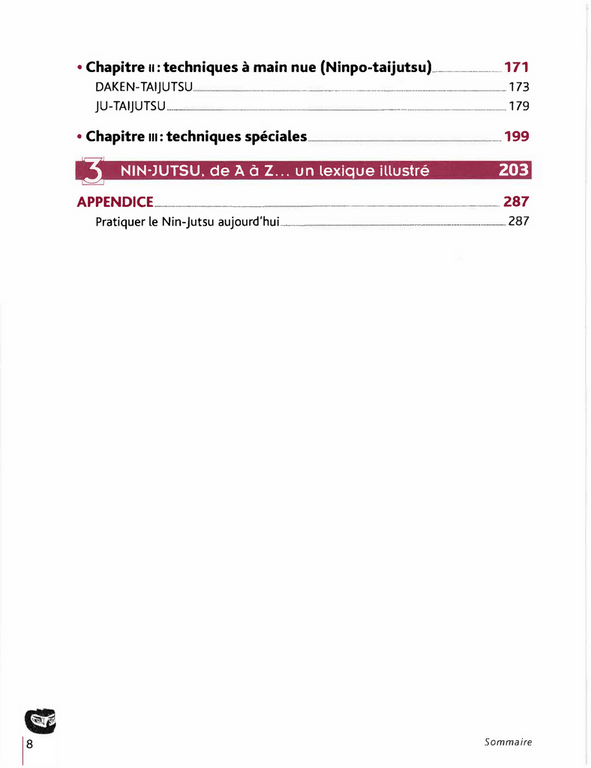 L'Histoire a crédité le combattant Ninja, ce « guerrier de la nuit », de prouesses incroyables : marcher sur l'eau, grimper des parois verticales, apparaître et disparaître à volonté, voler… Domaine longtemps tenu secret, pourtant aux racines des arts martiaux japonais, le Nin-Jutsu se révèle une incomparable technique de survie mais aussi une véritable philosophie de la vie. Les auteurs présentent une information théorique détaillée sur les techniques de combat et, pour la partie pratique, une centaine de techniques des Ninja clairement décrites et abondamment illustrées par des dessins explicatifs. Cet ouvrage, parfaitement documenté et exhaustif, est donc la nouvelle référence pour tout ce qui a trait aux Ninja (les « guerriers de l'ombre ») et au Nin-Jutsu, philosophie et technique de combat à l'origine des arts martiaux japonais.
