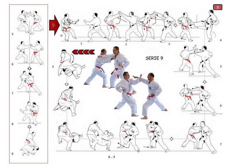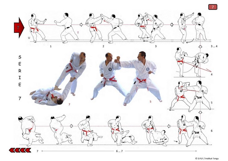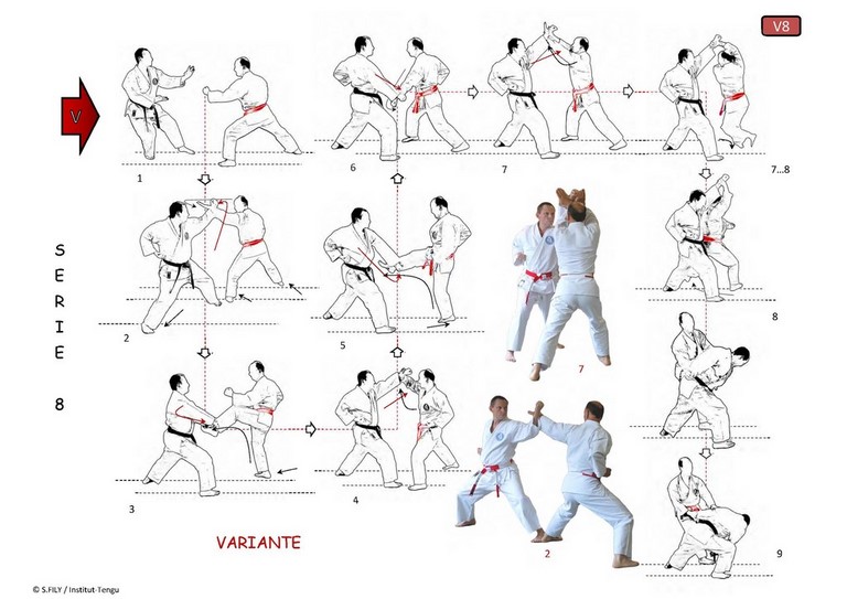 - d'introduire un nouveau concept de Kata exécuté avec l'aide d'un partenaire, qui est à la fois Tori et Uke lors d'un même échange, et responsable à part égale du déroulement harmonieux de l'ensemble (qui reste toujours plus "Kata" que "Kumite"). Ces 10 séries reposent techniquement sur des échanges entre partenaires issus de diverses écoles classiques et mentalement sur une réelle progression mutuelle et la non sacralisation de l’ego, contrairement aux Kata classiques (séquences en solo) où une telle dérive apparaît trop souvent. Une variante portant sur plusieurs séries de ce Kata a été introduite en 2007 pour en permettre l'exécution dans l'esprit comme dans la forme à des pratiquants rencontrant des difficultés dans certaines techniques de jambe de la forme Shotokan (en réalité un problème qui n'est pas toujours propre à des pratiquants plus âgés). Dans l'une comme dans l'autre de ses deux formes d'exécution, ces Kumite-katas (*) (Kumite-no-kata), déjà "anciens" (Koryu), continuent d'être enseignés et pratiqués dans les dojos du "Centre de Recherche Budo-Institut Tengu", et sa maîtrise fait partie des tests d'évaluation lors des passages de grades organisés par l'école (Ryu), dès ceux de Shoshi-ho (1er dan Tengu).
